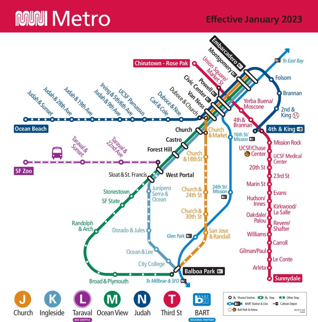Moovit has an easy-to-download Muni Metro System Map map, that serves as your offline San Francisco - San Jose, CA light rail or BART map while traveling. This map can be saved in your phone and it’s easy to share with friends. To view the downloaded map, no internet connection is required. It’s the offline light rail or BART map in San Francisco - San Jose, CA that will take you where you need to go.